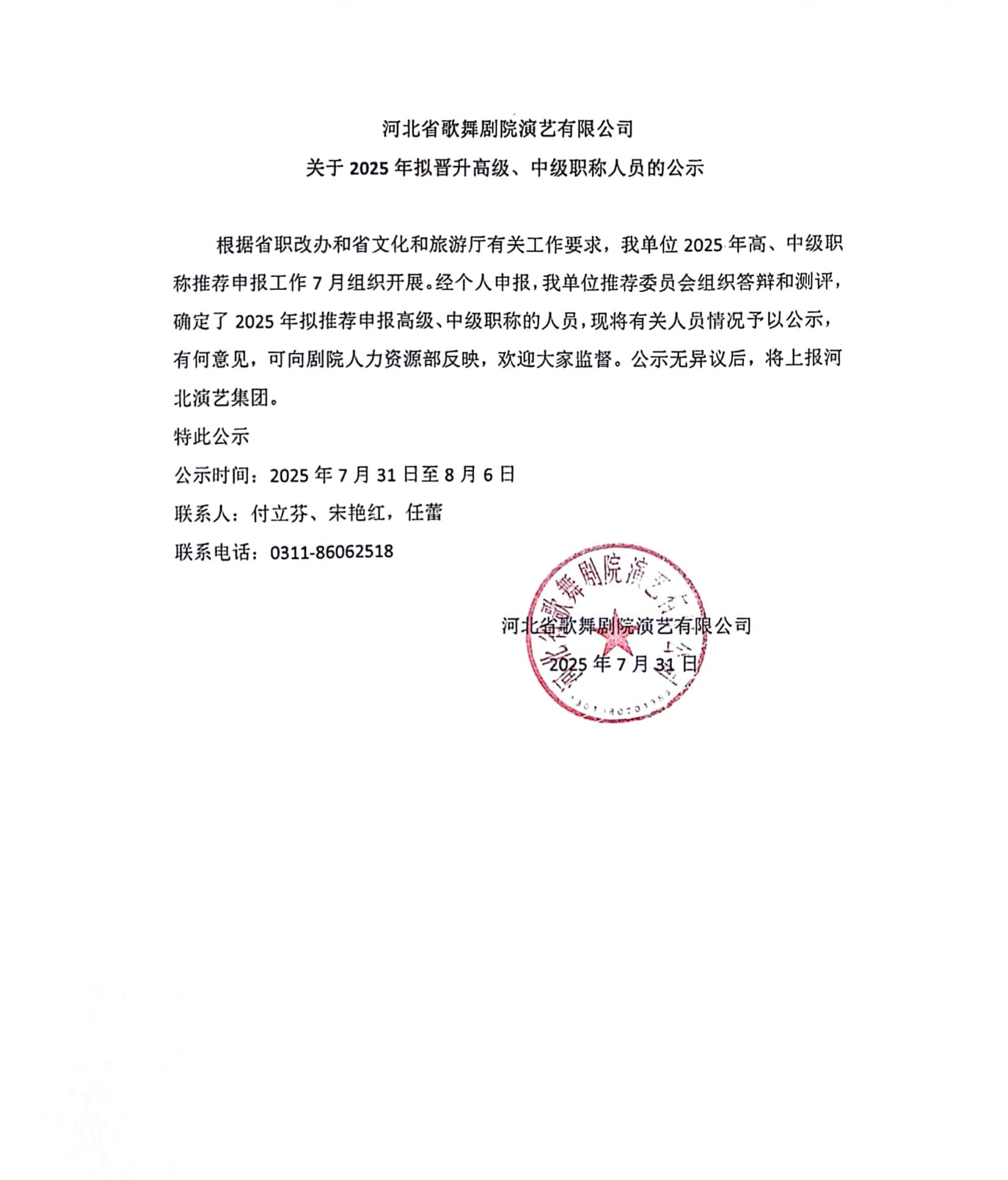河北省歌舞劇院演藝有限公司 關于2025年擬晉升高級、中級職稱人員的公示
